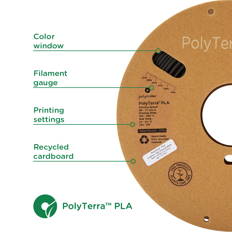 PolyTerra™ PLA to bioplastyczny filament do druku 3D zaprojektowany od podstaw w celu stworzenia nowej generacji przyjaznych dla środowiska filamentów. Polymaker połączył minerały organiczne z PLA, co znacznie zmniejsza zawartość plastiku, tworząc bardziej przyjazny dla środowiska materiał do druku 3D.